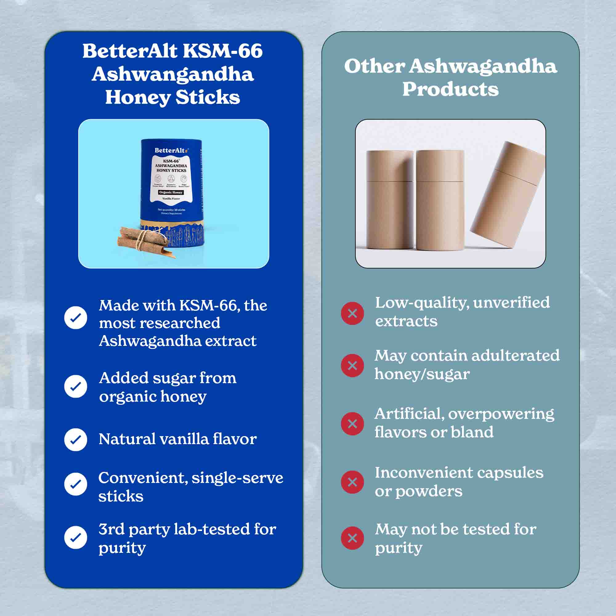 - BetterAlt’s KSM-66 Ashwagandha Honey Sticks are an easy and delicious way to unwind and support your mental and physical well-being. These honey sticks combine the power of 400 mg of KSM-66 Ashwagandha with organic Himalayan multiflora honey and a touch of natural vanilla flavor to promote relaxation, improve focus, and support restful sleep.