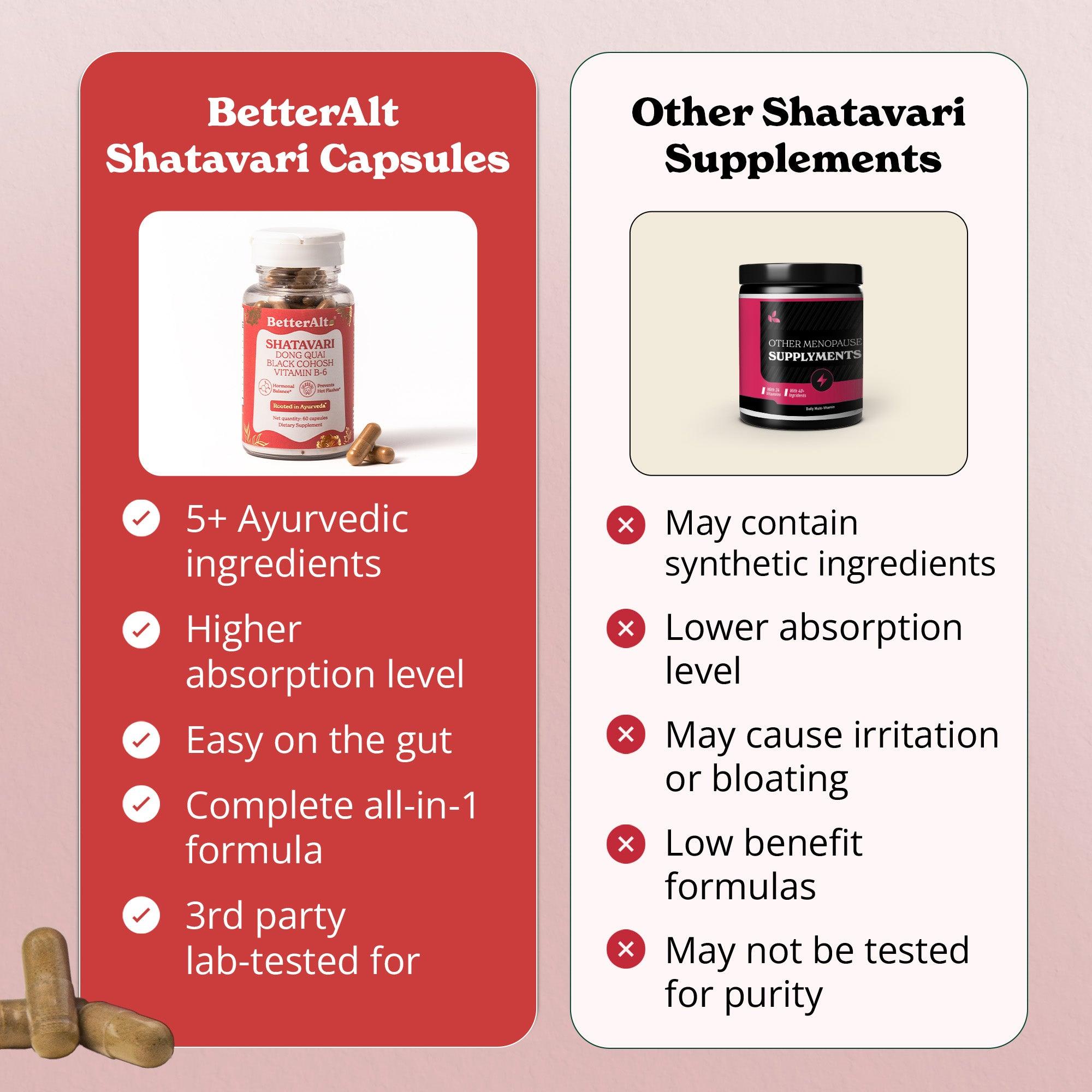 BetterAlt’s Menopause Capsules combine 5+ Ayurvedic herbs and 4 essential nutrients which may help reduce hot flashes, night sweats, and help improve mood. Shatavari and Dong Quai help support hormonal balance, while Black Cohosh helps promote calmness, helping you feel more in control during the transition. With added Vitamin B6, Magnesium, and Calcium, these capsules also help improve mood, induce calmness, and improve bone density, supporting overall well-being. Sustainably sourced and lab-tested for purity, these capsules are gentle on the gut, have no additives or fillers, and are made with clinically-studied ingredients.