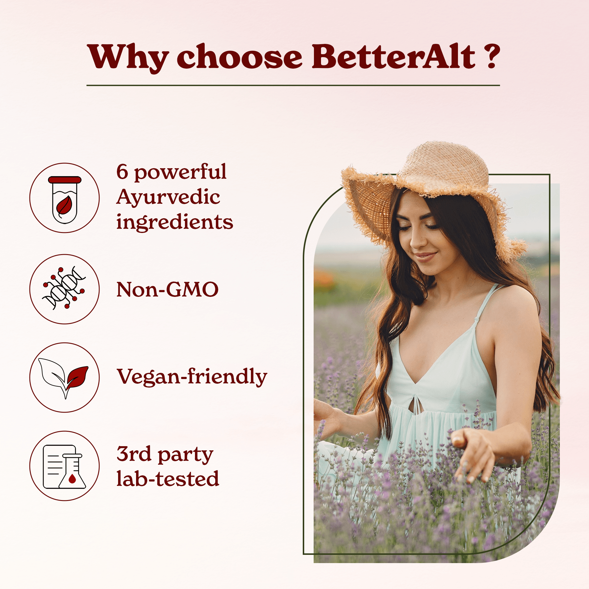- BetterAlt PMS+ Capsules are formulated with 6 potent Ayurvedic herbs like Shatavari and Chasteberry, which help manage hormonal fluctuations, relieving symptoms such as mood swings, cramps, and bloating.