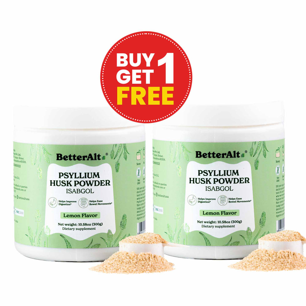 BetterAlt Isabgol contains a combination of Psyllium husk, Lactitol, and Sunfiber. These ingredients work together to provide triple-action digestive support, promoting smoother digestion, regularity, and gut health.