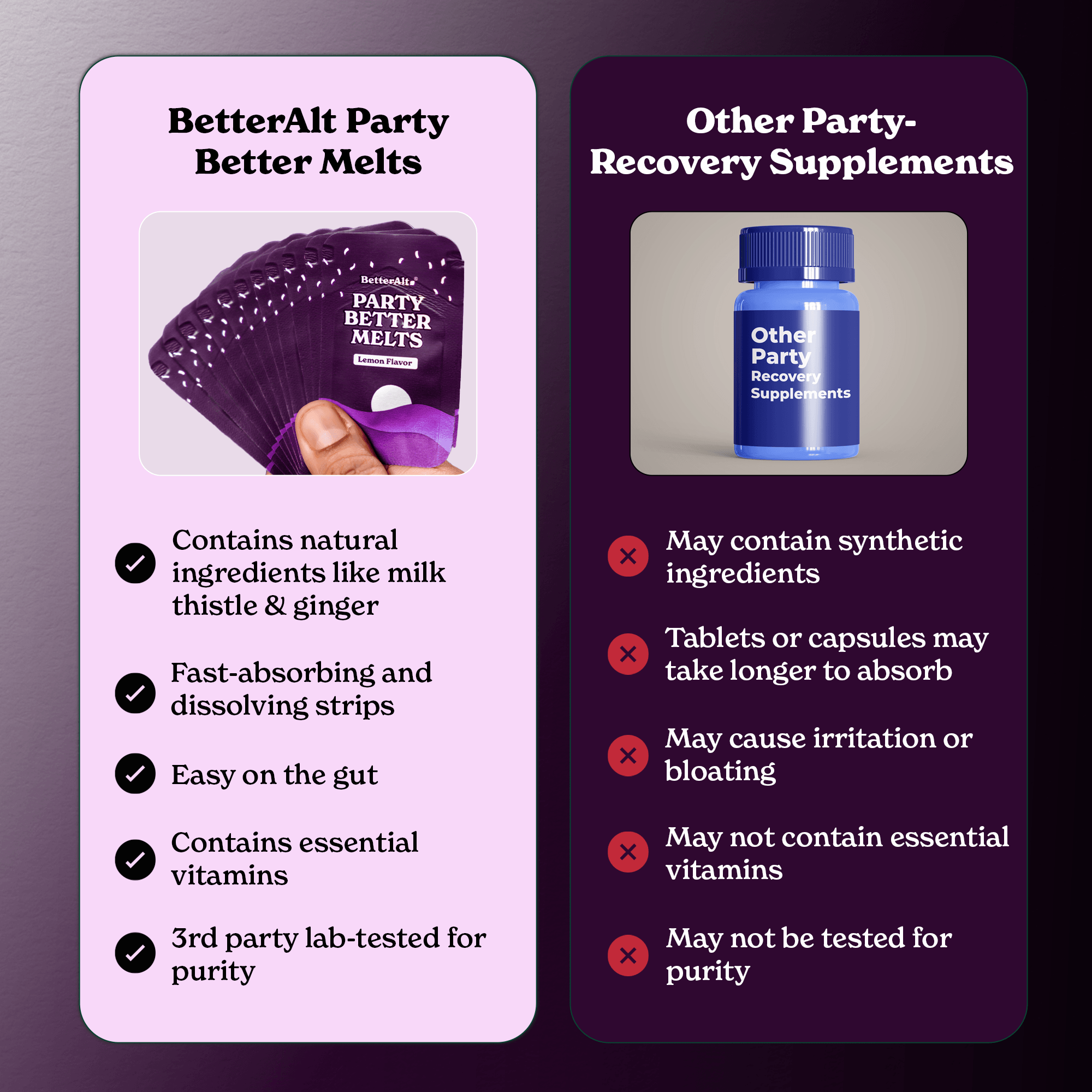 - BetterAlt Party Better Melts are fast-dissolving strips designed to support hydration & help you feel refreshed the next day after a night out.